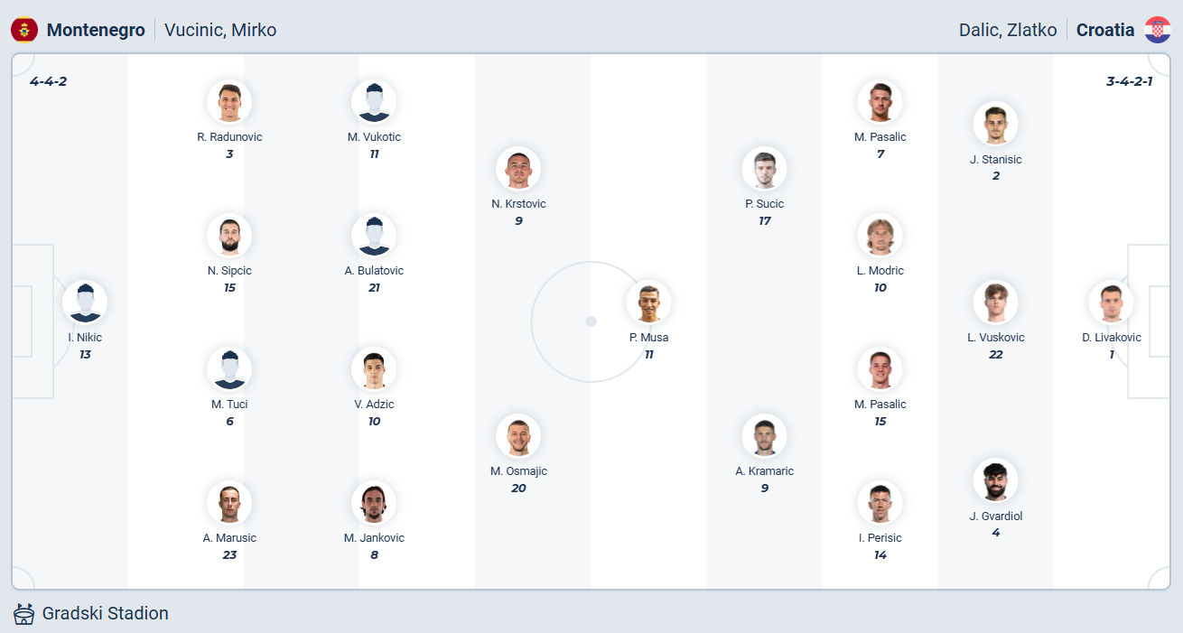 Lượt trận cuối cùng bảng L vòng loại World Cup khu vực châu Âu, Montenegro sẽ tiếp Croatia trên sân nhà với mục tiêu giành một kết quả tích cực. Tuy nhiên trước đối thủ mạnh hơn khá nhiều thì xem ra kịch bản này khó xảy ra.